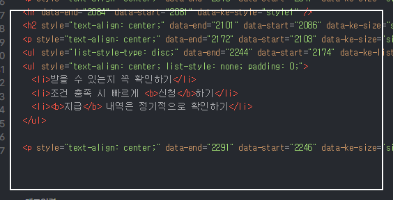 보다 확실하게 정렬 문제를 해결하고 싶다면, HTML 모드에서 직접 정렬 태그를 사용하는 방법이 있습니다.